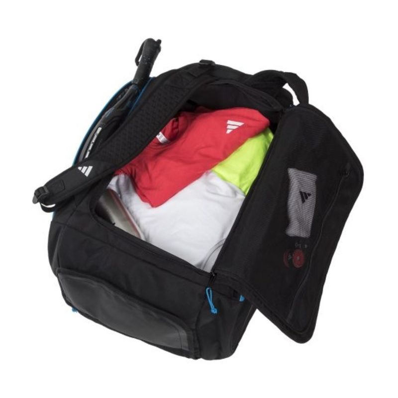 Con un amplio compartimento central con cremallera en el panel trasero, podrás almacenar cómodamente tu ropa y equipo deportivo. Además, cuenta con dos bolsillos laterales con aislamiento térmico, ideales para proteger y llevar tus palas de manera segura. Su compartimento inferior con ventilación de malla permite guardar tu calzado por separado, manteniendo todo organizado y fresco. No olvides el práctico bolsillo en la parte superior, perfecto para tus objetos personales más pequeños.